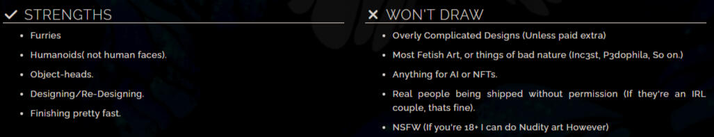 Dos:Humans, Furries, DnD Characters, Monsters, Ferals, Simple Mecha, Ponies, Reference Sheets, Fandom Characters, Ship art (Not real people unless specified permission given), Doodle Pages, Pets, Gifts, Nudity art (Must be 18+ to Purchase), RedesignsDon'ts:Complicated Mechas (Unless paid extra), Nsfw, Non-Valid Ships (P3d0s, Inc3st, Etc), Most Fetish art, NFT related things, AI related things, Complicated backgrounds, Overly complicated designs (unless paid extra), Suggestive art with minors